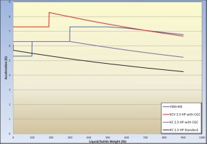 This is shown by the VSM Multi-Sizer (VSM-MS) line in Figure 1. The unit operates at 5.3 G with up to 100 lbs of fluid and solids loading on the basket, 6.3 G when loading is between 100-300 lbs and 7.3 G when loading exceeds 300 lbs and will maintain that G with up to 500 lbs of loading. Acceleration decreases beyond this point as motor speed cannot be increased any further.