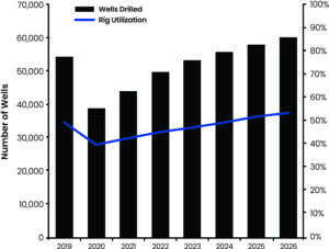 The global onshore rig count is expected to average 4,070 by the end of this year, which would already represent an 18% increase from the 2021 average of 3,450, according to Westwood Global Energy Group. By the end of Westwood’s forecast period in 2026, that rig count is expected to increase by an additional 24% to 5,050 rigs. Total wells drilled are also expected to rise from 49,600 in 2022 to 60,000 in 2026.