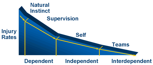 Mr Burns used DuPont’s Bradley Curve to demonstrate the evolution of a safety culture. Progressively declining injury rates are evidenced as workers and organizations move from operating on raw natural instinct through supervision (dependence), to self-awareness (independent) and finally to teams (interdependent). In the final stage, team members help one another conform and represent one another’s “keeper.”