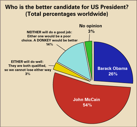 Our survey was dominated by US readers, so that the overall picture favors Mr McCain by 54% to 26% for Mr Obama.