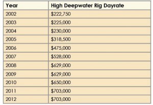 An example of dayrates, according to contractor fleet status reports, is $530,000 for the Noble Jim Day semisubmersible,under contract to Shell from January 2013 through January 2016. The rig, which is rated to operate in up to 12,000 ft of water, will drill several wells at similar rates prior to returning to Shell.
