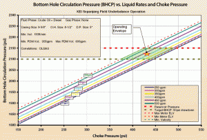 Figure 3 shows the flow model for UBD operations in Sepanjang. It graphs the bottomhole pressure against different pump rates and choke pressures. The shaded area indicates the operating envelope, where the various constraints during UBD operations are fulfilled. These constraints are minimum annular velocity, min/max motor equivalent liquid volume and the target drawdown.