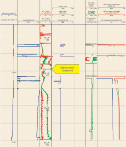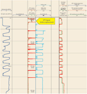 Figure 2 shows the signal strength using the conventional OBM, and Figure 3 shows the beginning of the transition to the OB TMB fluid. Finally, the conventional OBM being displaced by the OB TMB is shown in Figure 4. The green line shows signal strength is now readily apparent on the log.