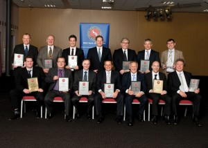 IADC NSC safety award winners and runners-up are (front row, from left) Jasper Goeting, Noble Drilling; Paul MacDonald, Stena Drilling; Andy Bain, Dolphin Drilling; Andy Forbes, Dolphin Drilling; Kenny Wood, Maersk Drilling; Pim Peters, Noble Drilling; Tore Larsen, KCA DEUTAG; (back row, from left) Mike Riach, Stork Technical Services; Sandy Fraser, Noble Drilling; Beau Wallace, Stena Drilling; Jon L. Richards, Diamond Offshore Drilling; Paul Horne, KCA DEUTAG; Gavin Sutherland, KCA DEUTAG; Nicholas McBride, Rowan Drilling.