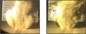 The StayCool technology has been refined through extensive computer modeling and rock-cutting test, such as the visual single point cutter apparatus. In this test, a lone PDC cutter is brazed into an instrumented test fixture within a hydrostatically pressurized chamber, including the test rock, which is often pressurized to match the in situ conditions of the downhole environment. During the test, a variety of operating parameters are controlled with the corresponding test responses measured for a quantitative assessment of the PDC performance in the sharp state. An important aspect of this test is the qualitative response of the chip generation, which is captured in high-speed videos (Figure 1).