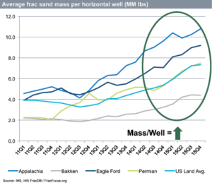 Further, operators are improving their well completions by increasing proppant volumes, extending lateral lengths and shortening fracture intervals. Although North American drilling activity has fallen by approximately 70% since late 2014, proppant demand has dropped by approximately 50% in the same period, according to IHS. ProppantIQ’s data shows that, on average, the amount of sand proppant pumped per horizontal well in the US Lower 48 has increased by 210% since 2011. However, part of this higher proppant usage per well is due to what IHS calls high-grading: The industry is fracturing only the very best rock, and this rock benefits the most from greater usage of proppant. “During the downturn, E&Ps have retreated to the places with the best acreage, which produces many times more than lower-quality rock, and obviously, this rock is just more economical.”