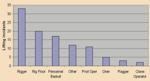 Looking at fatalities, the SLC found that seven of the 42 OCS fatalities reported from 2005 to 2009 were lifting-related, or 16.7%. Three of the 42 were associated with cranes and four with other lifting devices. Drilling operations accounted for six of those seven fatalities.