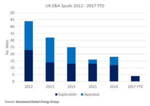 The number of exploration and appraisal wells spudded in the UK North Sea has steadily declined since 2012, although 2016 was slightly better than 2015. For 2017, Westwood Global Energy Group expects around 16 exploration wells and up to six appraisal wells to spud by the end of the year.