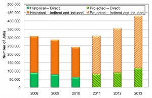 The states’ direct oil and gas industry employment is estimated to have dropped by 25,000 jobs over the same time period. The study projects that supported employment levels could exceed 320,000 in the four states by 2013 if projected spending and investment levels are met. This would represent an 80% increase over 2010 employment levels and would constitute approximately 85,000 direct industry jobs and 235,000 indirect and induced jobs.