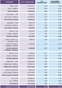 Middle East land worked 129.7 million manhours with three fatalities. Its LTI rate remained fairly steady, going from 0.05 last year to 0.06 this year, as did its recordable rate (0.12 in 2024 vs 0.13 in 2025).