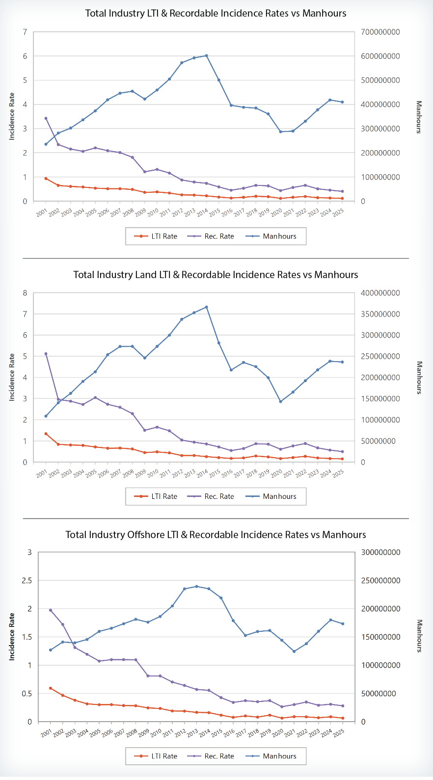 Middle East offshore worked 65.5 million manhours and saw similar LTI rates (0.04 in 2024 vs 0.05 in 2025) and recordable rates (0.17 in 2024 vs 0.18 in 2025).