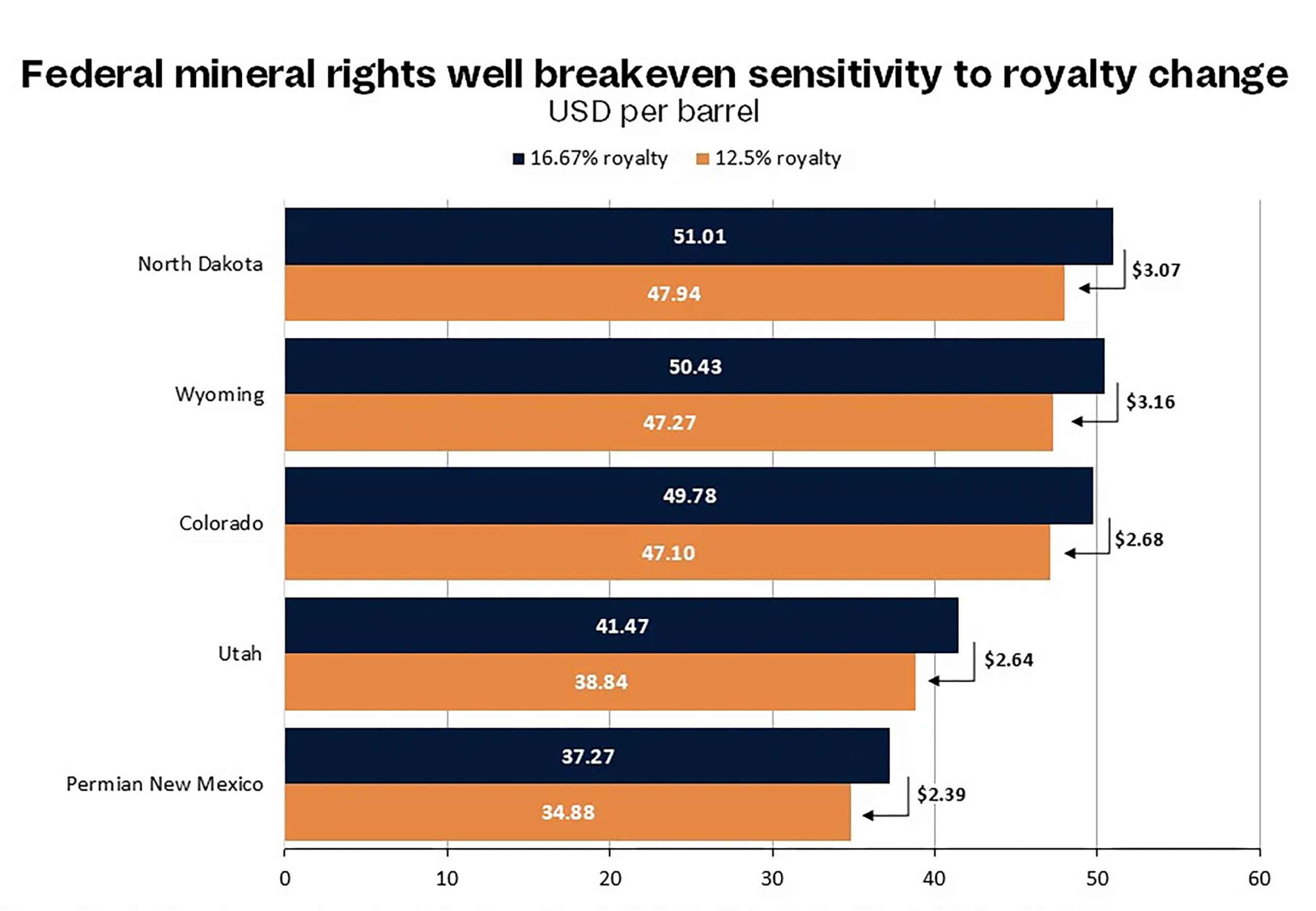 “The E&Ps are basically saying that these royalty rates are just going to be baked into the costs at future auctions,” he said. “A $3 difference in breakevens translates to significant dollars back in your pocket, especially in a commercial region like the Permian. In places that are more marginal, like North Dakota, that have a lot of federal land, that $3 difference could potentially be enough to incentivize a company to take on more leads. Maybe we see more activity in those regions. Maybe they put an additional rig there.”