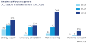 The immediate rise in capacity is being driven by short-term scale-up in North America and Europe, with natural gas processing still the main application for the technology. From 2030 onwards, hard-to-decarbonize industries such as steel and cement are forecast to be the main drivers of CCS growth, accounting for 41% of annual CO2 captured by mid-century. Maritime onboard capture is expected to scale from the 2040s in parts of the global shipping fleet.