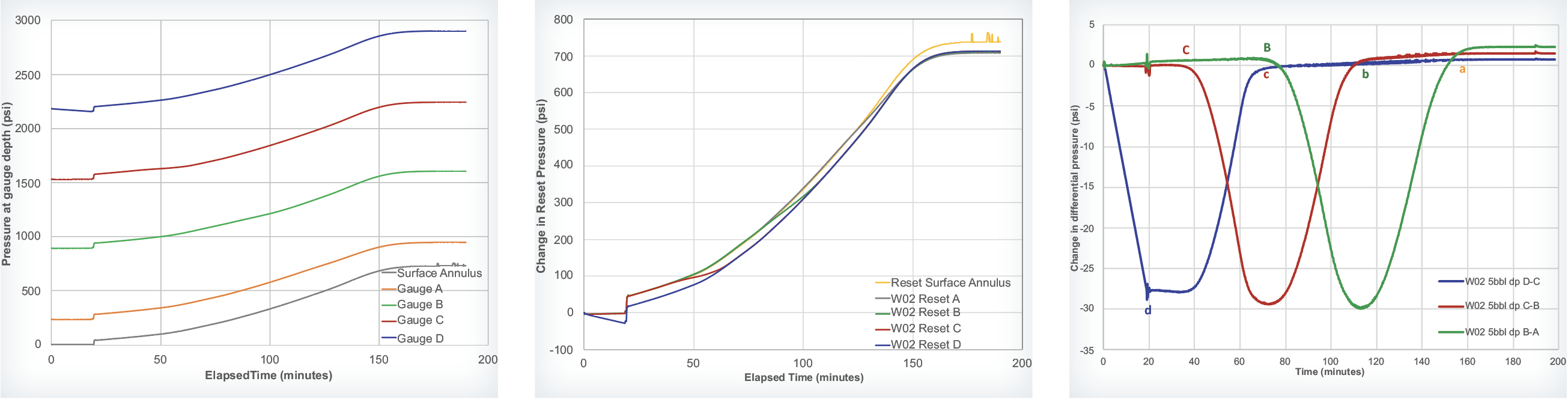 The zero time is when the gas front entered the annulus at gauge D and capital letters C, and B shows the elapsed time when the gas front reached gauges C, and B. The small letters d, c, b and a show the elapsed time when the gas tail reached gauges D, C, B and A. These figures demonstrate the possibility of using the methodology for the detection of gas and location of gas in an annulus.