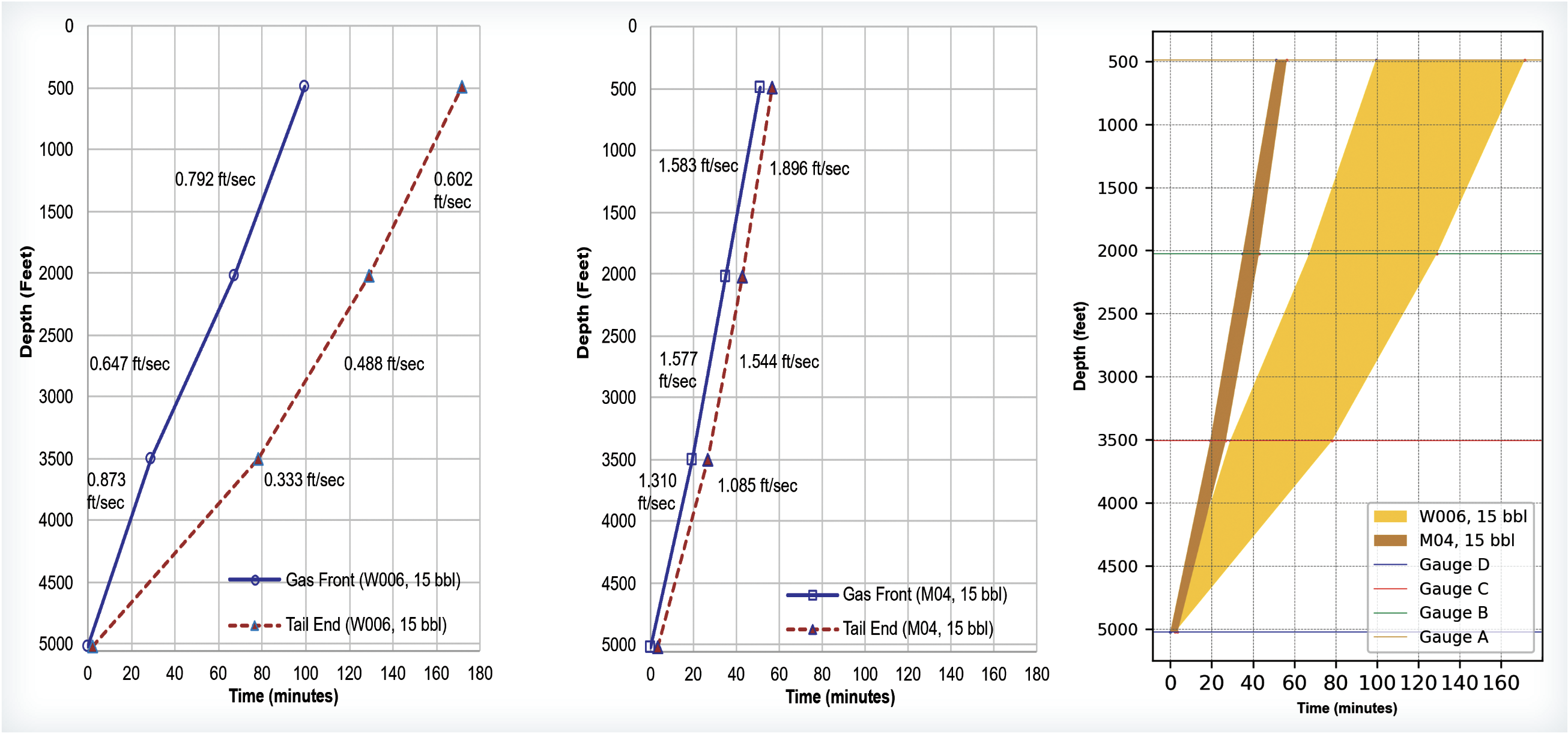 The average gas front and tail velocity between gauges is determined as the slope of the line between the gauge depths. Though both the lead velocity and tail velocity reduced as the gas cloud migrated up, the tail velocity reduced at a faster rate in water. This caused the gas cloud to stretch increasingly during migration. The greater the length of the gas cloud, the lower the gas fraction for a unit length of the annulus. The diverging trend of the gas front and tail end for W06 can be seen in Figure 4. Migration in SBM was finished in a third of the time it took for the same volume to migrate in water.