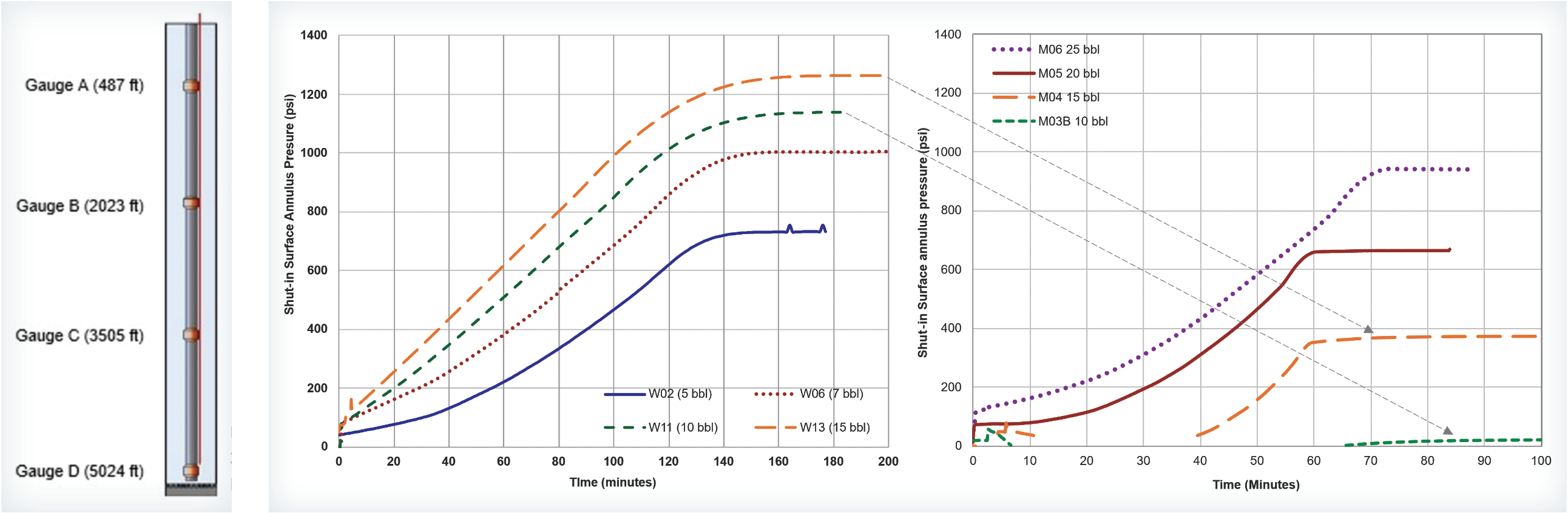 Only the pressure recorded by the downhole and surface gauges are used for the data analysis. All four downhole gauges and the surface annulus gauge show a similar trend of pressure increases due to gas migration, as can be seen on the left side of Figure 3. Because the research is interested in the change in pressure as the gas migrates, a plot of change in pressure at each gauge is shown on the middle plot of Figure 3. The actual pressure at each gauge was corrected by subtracting the stabilized pressure of the stagnant liquid column above it before the test began. To get a better understanding of what is happening to gas, a plot of the difference in the reset pressure values between adjacent pairs of gauges is shown as a differential pressure plot on the right of Figure 3.