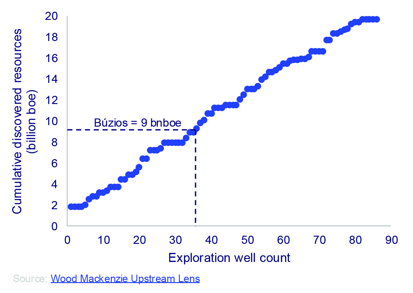 This creaming curve illustrates the cumulative hydrocarbons discovered in the Guyana-Suriname Basin, with each blue dot representing the total amount of hydrocarbons found in the basin after each exploration well was drilled. Plotting the resources discovered in Brazil’s Búzios field (at least 9 billion boe) against this data, it can be seen that 35 wells had to be drilled before Guyana-Suriname reached comparable levels. This should be kept in mind, according to Wood Mackenzie, when evaluating exploration in Brazil’s Equatorial Margin. While there is optimism about this frontier region, the industry should not expect a rapid pace of development and returns, particularly as significant concerns remain about exploring in an environmentally sensitive area.