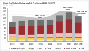 The Middle East saw a significant decline in its offshore rig count in the wake of Saudi Aramco’s 2024 jackup contract suspensions. In 2025, the marketed offshore rig supply for the region dropped to 168, down from 183 rigs in 2024, with those rigs almost entirely coming from the six Gulf Cooperation Council (GCC) countries – Bahrain, Kuwait, Oman, Qatar, Saudi Arabia and the UAE.