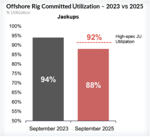The committed utilization for jackups – encompassing rigs that are either already contracted or have a commitment to work – stood at 88% as of September 2025, down from 94% two years ago, according to Westwood Global Energy Group. High-spec jackups, however, are faring better, with utilization still hovering around 92%.(Click the image to enlarge.)