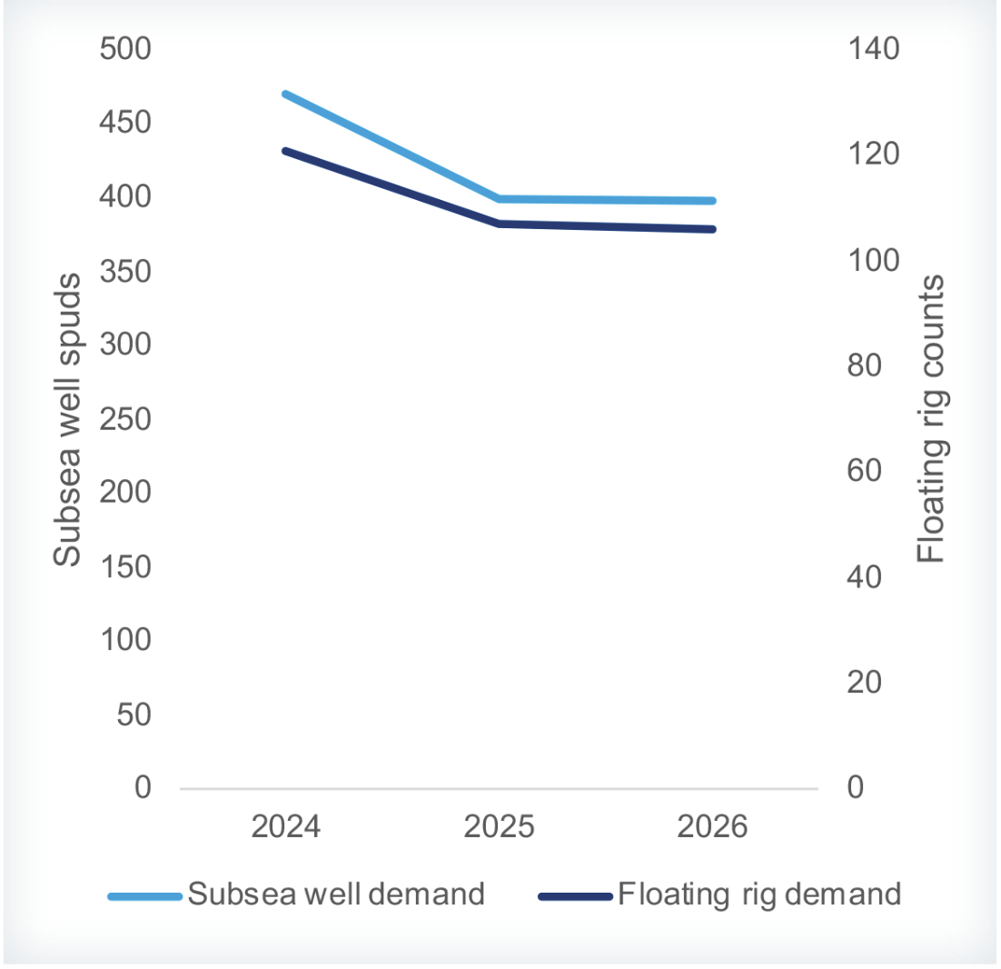 Subsea wells should also stay relatively flat next year after seeing a year-on-year drop: The well count averaged 470 in 2024 and will fall to 400 in 2025, then 398 in 2026.