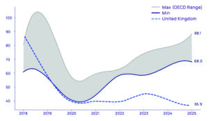 National value destruction in the UK North Sea: The UK oil and gas sector has become an outlier among OECD countries due to persistent fiscal and regulatory uncertainty. The Implied Long-Term Oil Price for transacted UK North Sea assets is charting around $40 per barrel, a 40% discount compared with the OECD average of roughly $70 per barrel. This discount reflects the upstream industry’s declining interest, spurred by major changes to the fiscal system mixed with regulatory uncertainty. (Read about the UK government’s decision to maintain the Energy Profits Levy for 2026 on Page 44.)