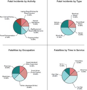 Looking at the eight fatalities by the employees’ years of service, the top category was employees with between one to five years of service; they accounted for three of the eight fatalities. By activity, travel/transportation accounted for the most fatalities, while “struck-by” was the top category in terms of incident type. By employee occupation, the fatalities were split evenly among floormen, drillers/assistant driller and truck drivers, each accounting for two deaths. See Figure 1 for a breakdown of 2015 fatalities.