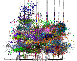 ESG Solutions has been developing and applying microseismic technology for Nexen in the Horn River Basin in northeast British Columbia, Canada, since 2010. This image from Nexen’s shale gas field shows 78,000 microseismic events colored by stage and recorded on three downhole geophone arrays