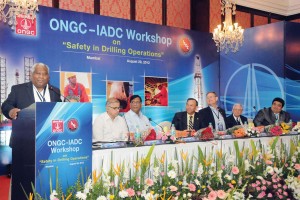 Arun Karle (from left), Askara; Anup Kumar (partially visible), R.V. Marathe, M.D. Joshi and A.K. Hazarika, all with ONGC; Ken Fischer, IADC; Norman Edwards, consultant; and Chit Hlaing, IADC, participate in the 2012 ONGC-IADC workshop focusing on safey in drilling operations on 29 August in Mumbai.
