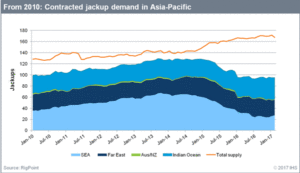 Demand for drilling rigs in the Asia Pacific has remained stagnant, and perhaps even decreased, over the past year. “We’ve seen jackups, in particular, struggle to find work after coming off contract,” said Yun Yun Teo, IHS Petrodata Principal Analyst for Rigs, Asia Pacific. The average number of jackups on contract in Southeast Asia, which remains dominated by shallow-water drilling, was 44.5 in 2015, and that number fell to just 25.9 in 2016, according to IHS Petrodata. “Some have moved to other regions to find work. Despite that, drilling contractors have trouble finding work. It’s a sign of how bad things are.”