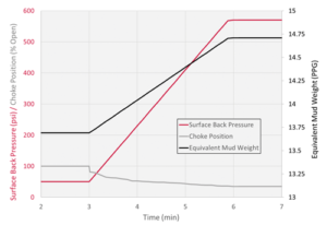 Figure 1 illustrates an increase in SBP as the choke reacts after detecting an influx. The corresponding increase in bottomhole pressure results in an increase of downhole EMW, illustrated in Figure 2, which demonstrates that the annular pressure profile can be swiftly manipulated to prevent further intrusion of an influx. Note that faster choke reaction times than those illustrated in these figures are possible depending on the specific well and system configuration. By enabling a swift response, SBP manipulation can effectively minimize influx size, compared with conventional well control. EMW with and without choke pressure lines represents equivalent mud weight at specific value of choke pressure.