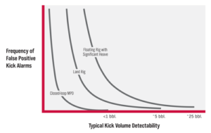 After several high-profile well control incidents in recent years, there has been a tendency to tighten kick alarms settings on offshore rigs. This practice has increased the frequency of false-positive kick alarms, resulting in unnecessary NPT, as well as increasing the risk of a real kick being interpreted as just another false alarm. A significant operational benefit of RFC-HSE MPD is its ability to reduce the frequency of false alarms, illustrated in Figure 4.