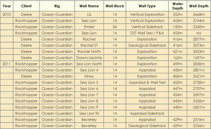 In December 2009, Rockhopper Exploration joined Desire Petroleum with an assigned contract for the Ocean Guardian to drill two additional exploration wells. The initial program was for the rig to drill up to six firm wells in the NFB for Desire and Rockhopper.