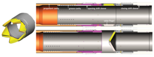 As the shift sleeve moves forward, grease from the grease cavity, is expelled into the wellbore through a series of vent holes. When the shift sleeve reaches the end of the flapper fingers and they start to protrude into the wellbore, any upward flow acts to enhance the drive of the fingers into the closed position. Notably, the flapper finger design ensures that the six triangular fingers will close together so that the sealing surfaces are appropriately mated.