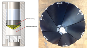 The valve housing and flapper fingers were modified with grooves to accept the molded-in elastomers and a larger center plug. Two center plug materials were tested during this process, and a softer material was chosen. The final elastomeric design was tested, without modification, at each condition in Table 1. Only slight valve leakage was observed when priming the system, where the pressure was essentially zero, and prior to energizing the valve with the accumulators. Once the accumulators were primed, there was no leakage. Post-test, pressures were bled to zero while continuing to monitor performance of the valve. Leakage did not occur until the system pressure was below 100 psi.
