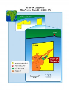 “The Paon well marks the first deepwater discovery in the CI-103 block offshore Cote d’Ivoire and opens up an entirely new play for the country and our partnership,” Anadarko senior VP of worldwide exploration Bob Daniels said. “This discovery confirms the Upper Cretaceous fan system present in Ghana extends westward into Cote d’Ivoire and provides significant running room within the CI-103 block. We are very encouraged by these results and look forward to appraising this discovery and testing a number of other identified prospects on our acreage.”