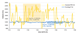 Figure 2: By automatically adjusting DOC control, the adaptive bit mitigates vibrations to smooth out drilling performance (blue line), enabling a longer and faster run with consistently lower surface torque compared with an offset with a standard PDC bit (yellow line).