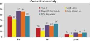 The contaminants used in the study were 40-lb/bbl artificial drilled solids, 10% seawater, a 2-ppg weight up with barite and 5-lb/bbl lime. The contamination testing results are presented in Figure 2.