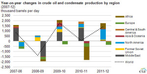 This animated map shows how world crude oil and lease condensate production, measured in millions of bbl/day, has changed since 1980 in key oil-producing regions. Growth in North American crude oil production and recovery in African and Asian markets contributed to a record global production of 75.6 million barrels bbl/day in 2012, according to an agency brief.