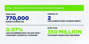 • More than 430,000 surveys were conducted across more than 85,000 production sites as part of the Leak Detection and Repair Program. Of the more than 235 million component inspections performed, only 0.04% were found to need repair.