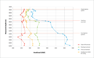 Additionally, much higher torque and drag could be encountered versus that of the model. A second Agitator system was prepared in case drilling conditions dictated that it would be required in the high-drag concentration zone. The prediction was that the BHAs with dual Agitator systems would be required from 5,400-m MD.