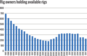 The number of rig owners holding available rigs is also quantified. In recent years, the number of owners had remained mostly constant, with new drilling companies mostly offsetting companies ceasing operations. For 2017, the net number of rig owners registered a decline. Company closures, mergers and acquisitions, and large numbers of rigs being stacked all contributed to a net reduction of 25 companies this year. The total number of rig owners declined to 225 compared with 250 last year. The 10% reduction in owners is significant (Figure 8).