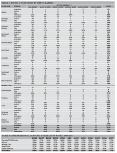 The regional figures in Table 4 are a combination of land and offshore statistics. When looking at total US land rigs, utilization rose to 45%. The utilization rate was 23% in 2016. The US marine fleet utilization continued to drop in 2017 to 41% versus 62% last year. Demand for exploration and development offshore rigs by type varied greatly, with drillships having the highest utilization, at 71%, and semisubmersible rigs the lowest, at 33%.