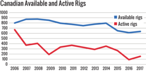 The Canadian available fleet rose by 4% to 637 units during 2017. The available data did not show clear evidence of rig removals from 2016 to 2017, but attrition is expected to become more obvious as activity levels stabilize and excess supply is trimmed.