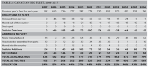 The net addition of 24 units helped the Canadian market to rise from its historical low of 612 available rigs in 2016 to 636 units in 2017. However, oil prices will need to move substantially higher in order to sustain levels of 700 available rigs, more in line with the 10-year average (Table 2).