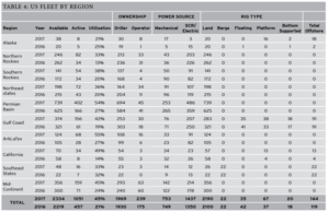Census results for the US are also calculated by region. Most US regions had increases in available rigs for 2017, while the Rockies and Northeast states saw modest reductions to their fleet. The number of active rigs rose in every region for 2017. The year-to-year breakdowns for 2016 and 2017 are shown in Table 4.