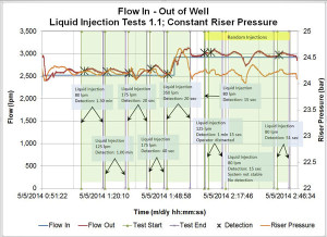 Tests using the riser pressure sensor showed the system was able to detect and signal liquid influxes/losses to the CMP operator in less than two minutes, often less than a minute. An influx test of 80 L/min showed that both flow out of well and pump performance were early detectors (51 seconds). To prove the system could quickly detect a gas influx, the team conducted the same tests using Nitrogen injected into the standpipe manifold to displace and replace mud in the drill pipe. The influx was detected in less than 30 seconds.