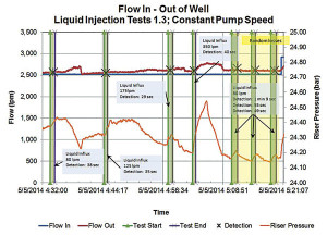 The team devised five tests, each involving the injection of liquids and gases and the detection of influxes and losses. The tests were designed to prove the system’s capability to quickly detect a gas or liquid influx or loss, circulate the influx from the well while holding constant bottomhole pressure, handle background gas and provide a comparison against conventional well control.