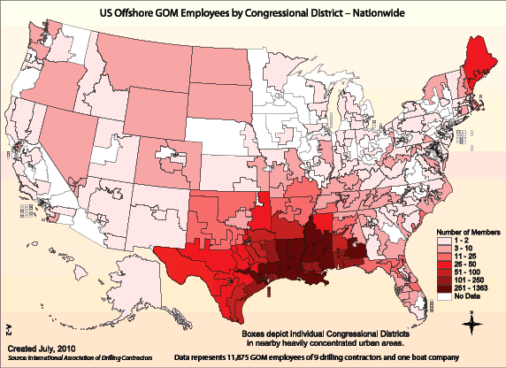 The association also presented results from its study on the offshore rig worker population. Data on residences of 11,875 offshore employees and onshore support personnel showed that these workers call 68% of all US congressional districts home. Residences of these workers are spread across 296 congressional districts. There are 435 such districts in the US. Nine drilling contractors and one boat company participated in the project.