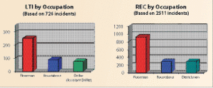 • Similar to previous year findings, the floorman position saw the largest percentage of lost-time and recordable injuries.
