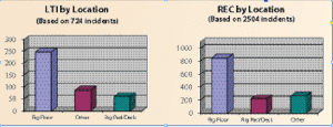 • Most lost-time and recordable injuries occur on the rig floor during drilling operations.